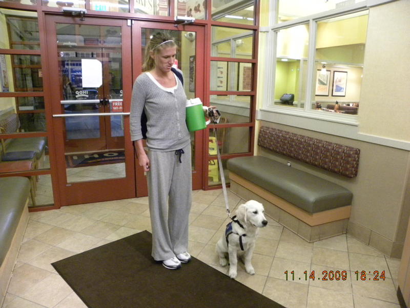 Speaking of hearts, Heather, Windsor’s trainer said, “He melts the hearts of all who meet him.” And, boy, is his heart getting big! Just prior to five months old, he weighed 50 lbs.! That’s large for his age, but as a mobility service dog, he needs to be big and strong for the times I “Brace” on him when I lose my balance or am getting up from having fallen to the ground. Keep growing little guy! Notice in the pics, he’s not all work and no play. Have you ever seen the “Easter Bunny Dog” before? In the pics where he is in a restaurant, notice his calm public etiquette, a service dog requirement – seen but not heard (no barking, no frolicking, no sniffing or eating food from the floor/ground). Also in the pics are Windsor’s doors for training. “Up!” “Push!” He and I, as a team, will open doors that are difficult for me in public. Right now, he is too young, so Heather is “the muscle” and Windsor goes through the motions.