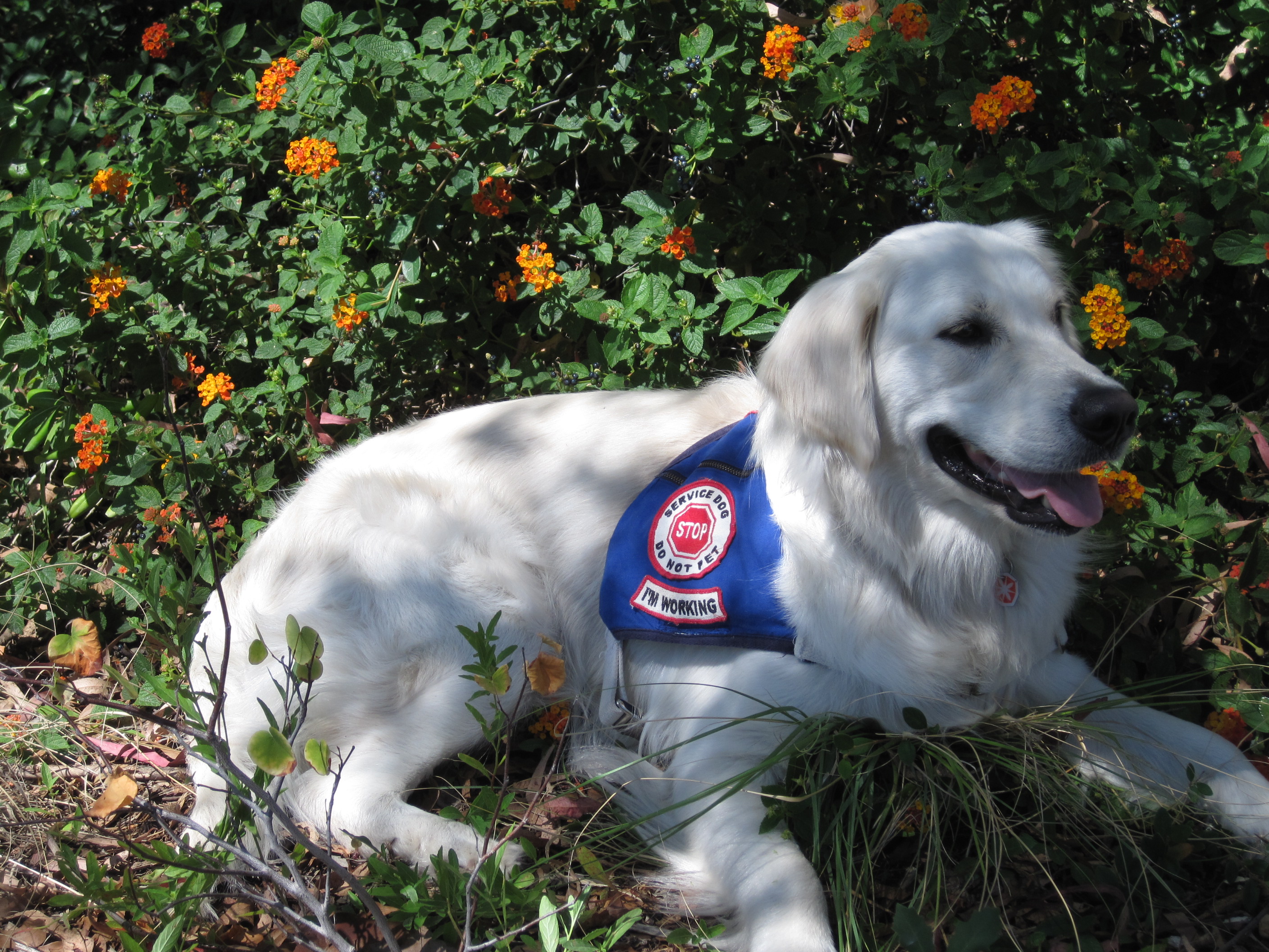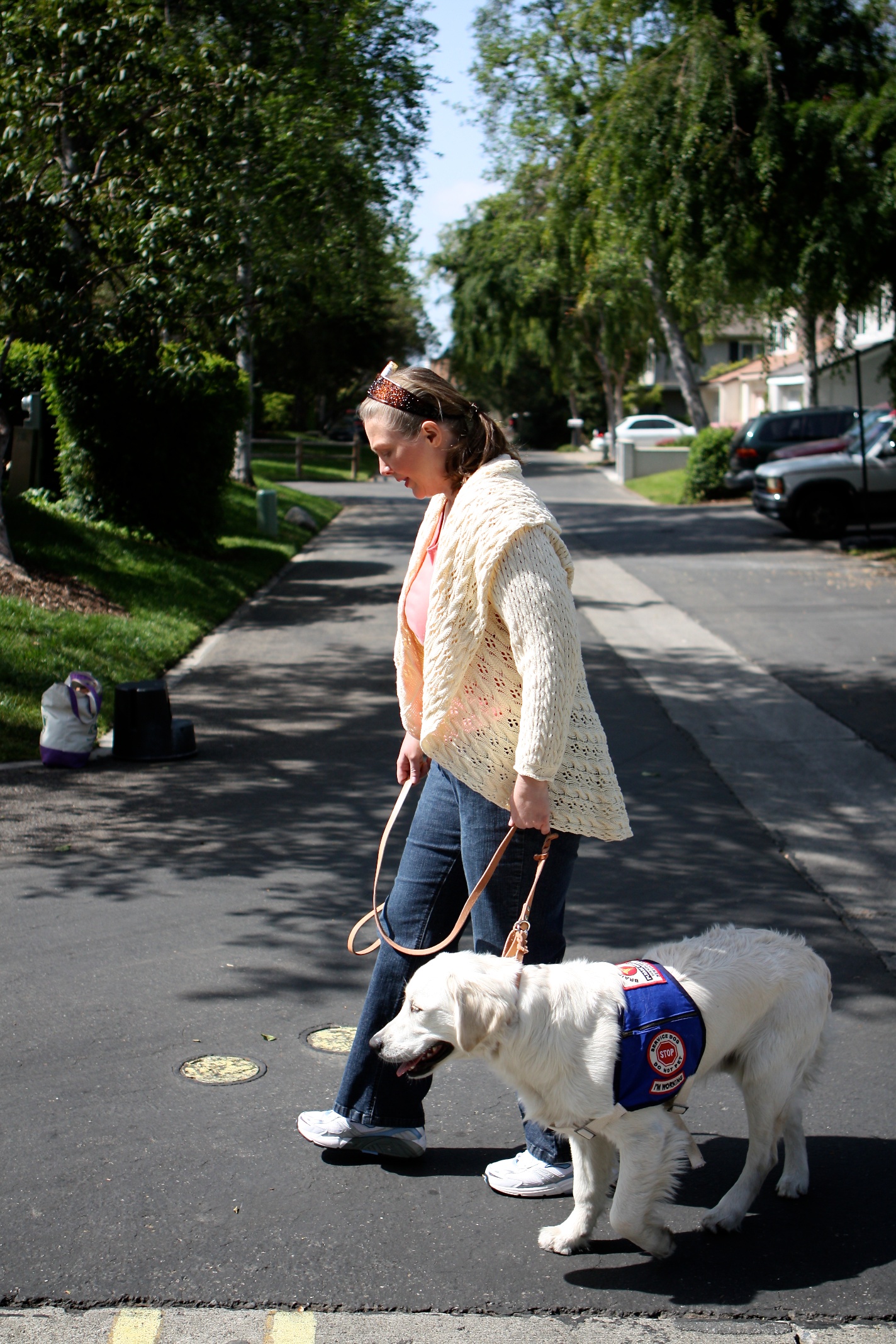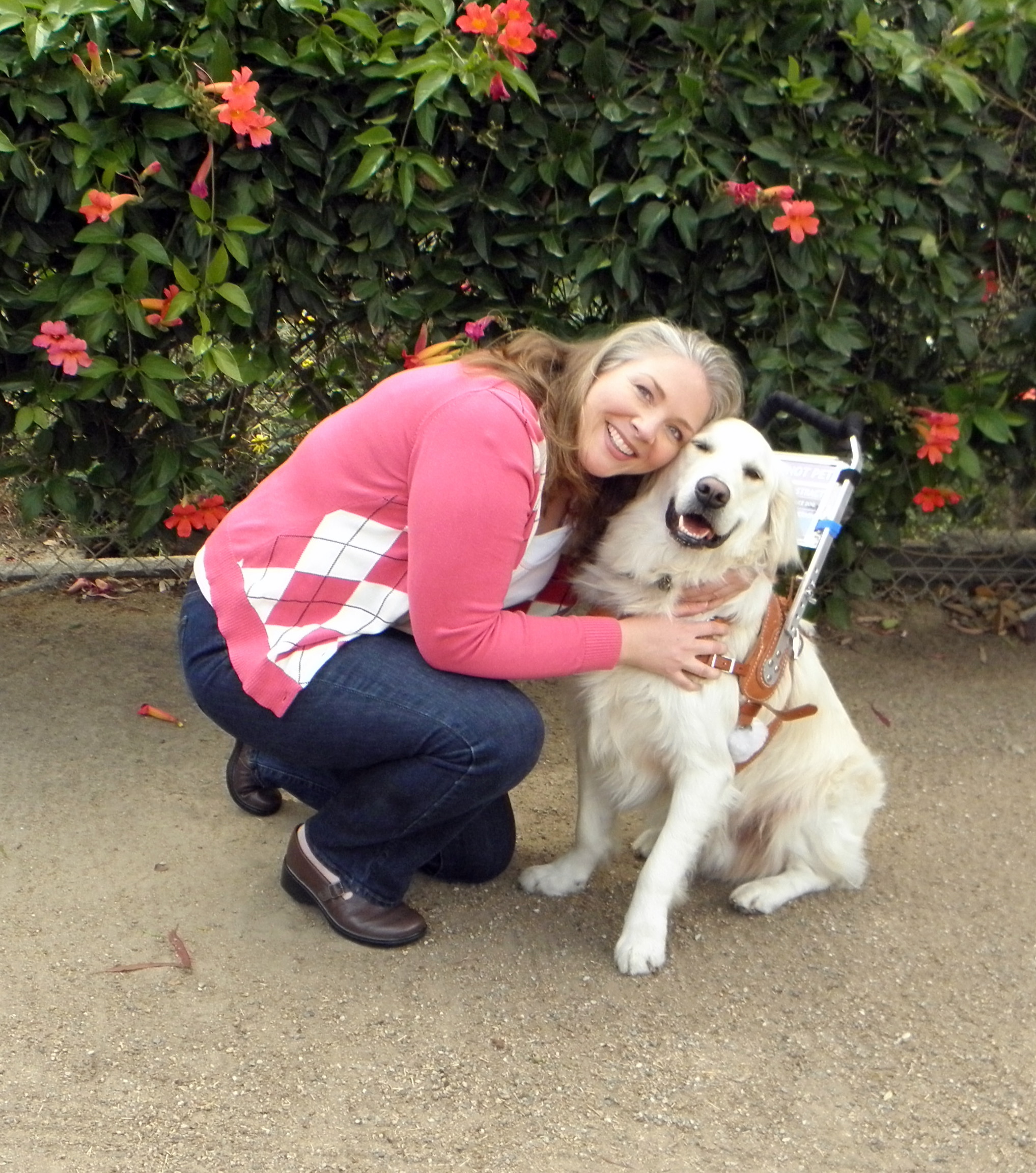 In this video, I am working to progress with walking.  Windsor does have a mobility harness which helps me to balance and walk more easily, but in this clip, he’s wearing his vest and yet can still help with my balance.  Windsor helps me to walk with more stability, to cross the street safely, and he performs a medical alert.  My talking is limited from my brain injury, and is even more reduced from the setback.  I do not verbally communicate to Windsor much because it takes great concentration for me to focus on my steps.  Notice how Windsor still knows what to do even with my limitation(s).