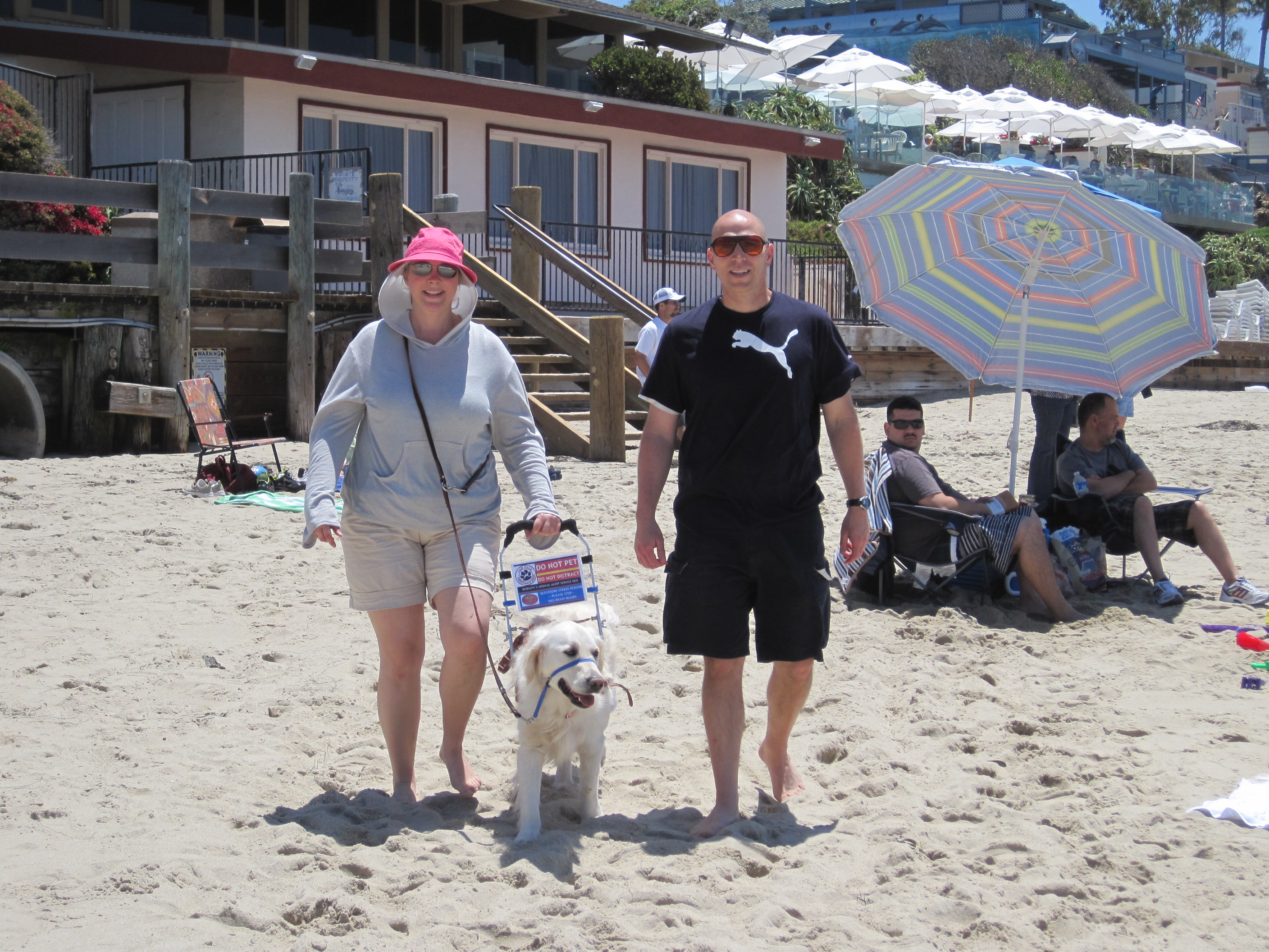 Two years ago, I last saw my brother.  By then, I was able to walk and jog a few times a week.  We worked out together one time that visit.  That was a precious moment to share as brother and sister, something we’d not done for many years.  On that walk/jog we talked about our needs, our ways to pray for each other.  I shared with him how I felt God was calling me to begin the process of finding a service dog.  Since the brain injury, I’ve learned alot about having faith and putting my trust in God when He leads me through what may feel impossible at times.  As my brother and I talked, I shared that I had no money for a service dog, I didn’t have the answers as to how to acquire a service dog, I had no idea how God would lead, but I knew He was pushing me strongly into another area to build my faith and trust.  What a grand time that on this visit, two years later, my brother met that service dog that he and I prayed for.  Here we are walking on the beach together (another sign of progress for sand is difficult), all three of us, brother, sister, and the newest family member, Windsor B.