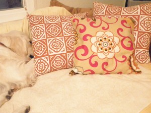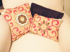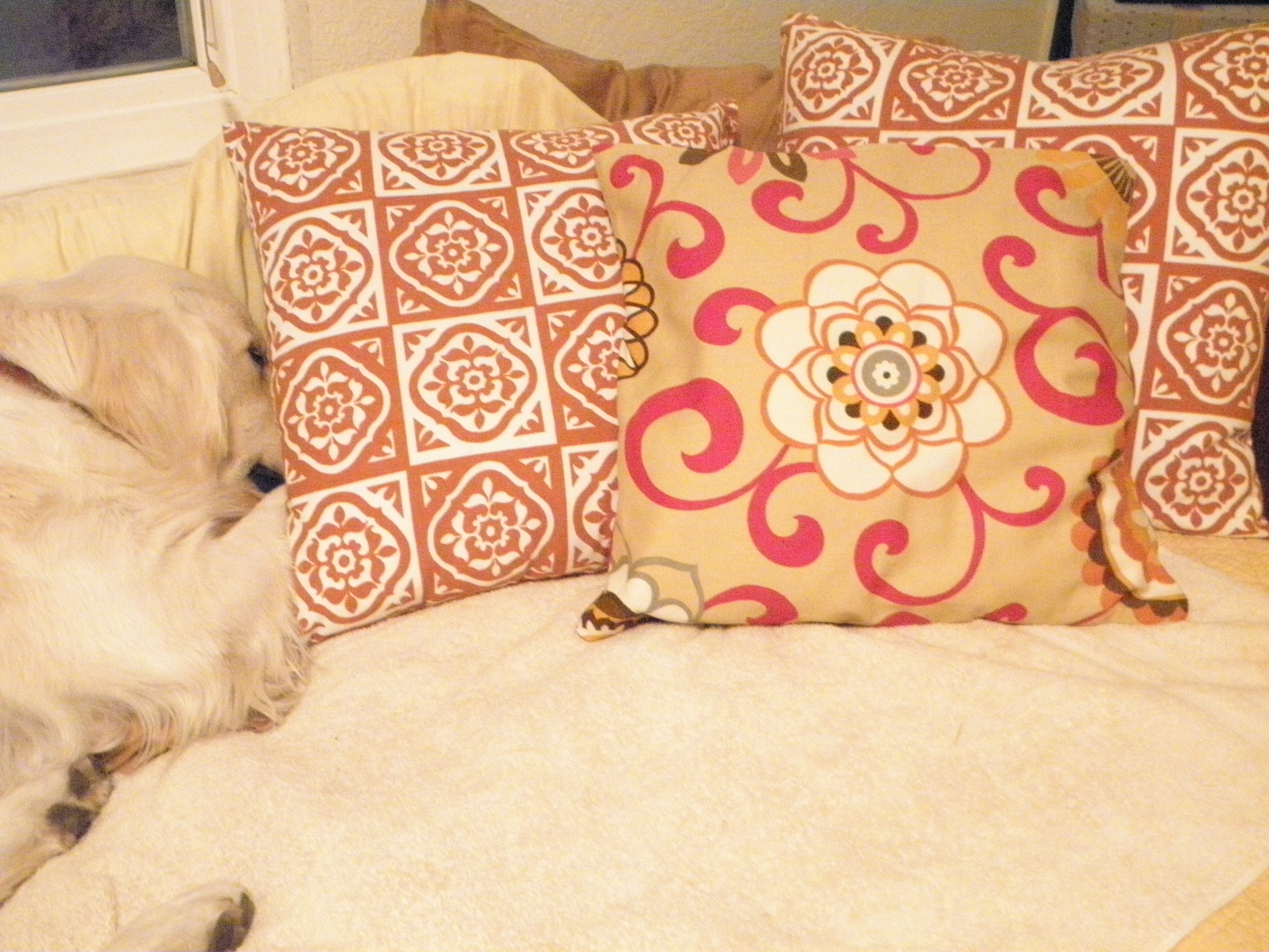 I did not make the cream, fluffy pillow on the left. That is God's handiwork! I made the pillow that is front and center. It was quite the challenge for me to measure and configure so the main attraction flower would be centered.