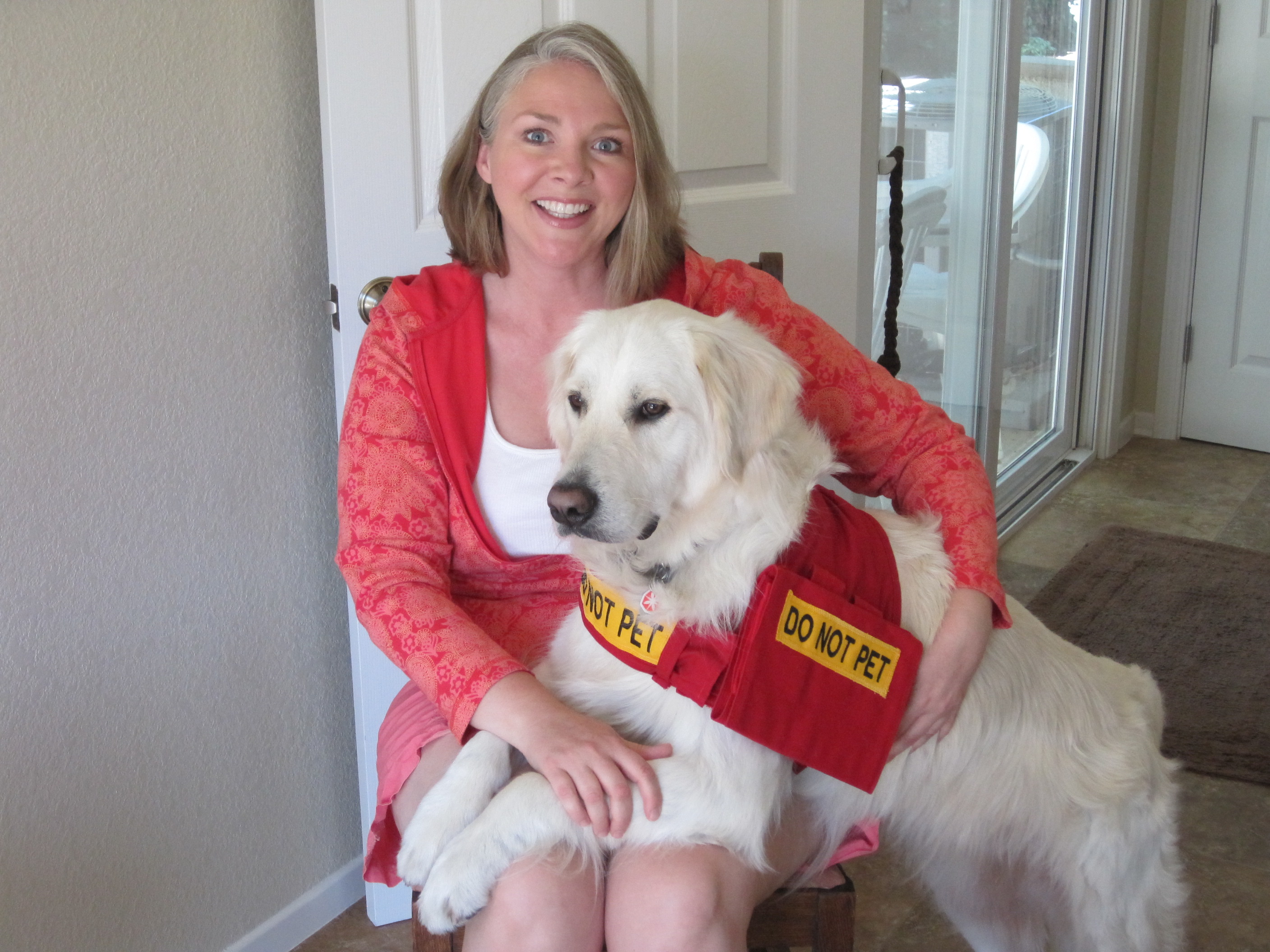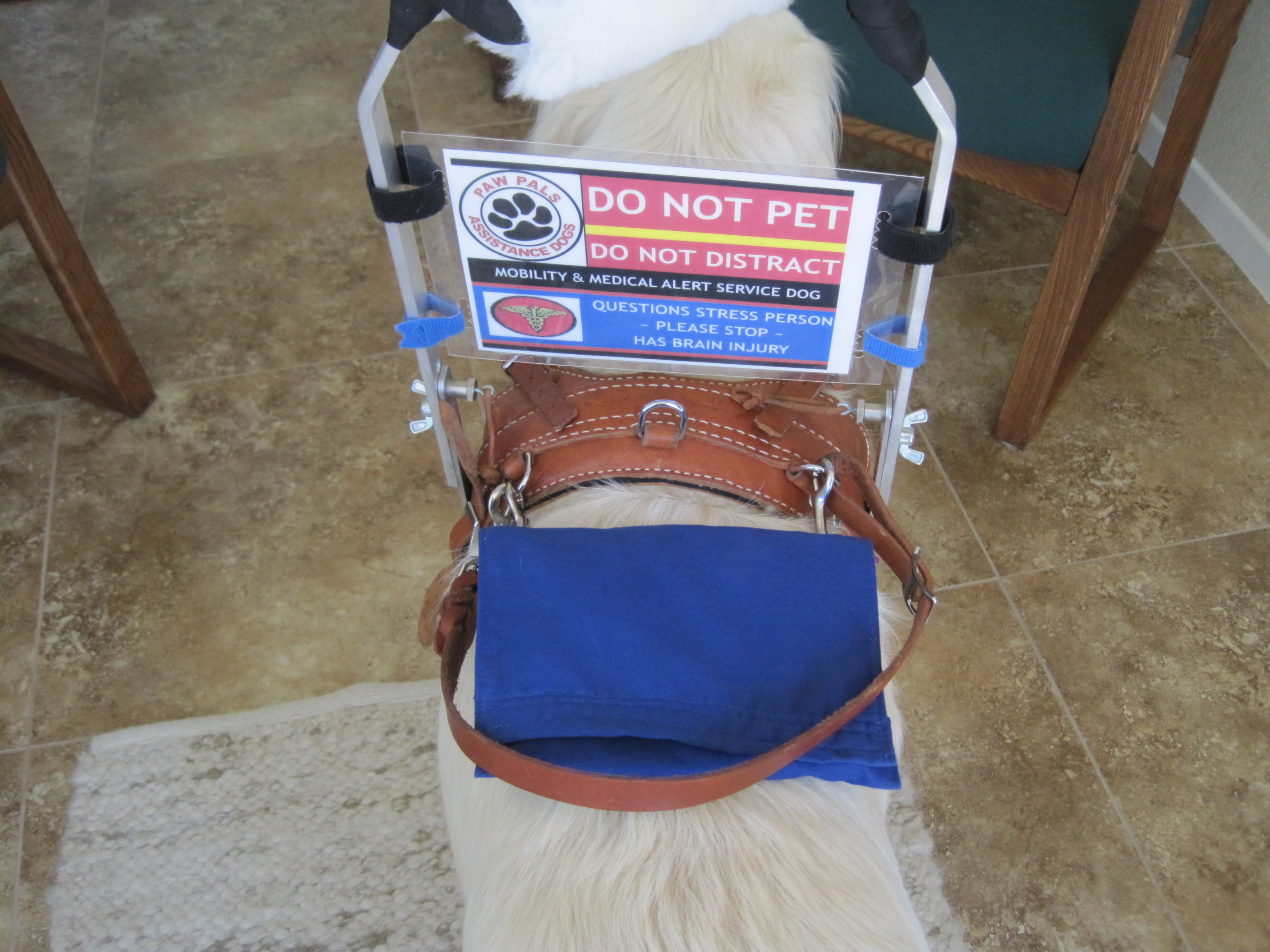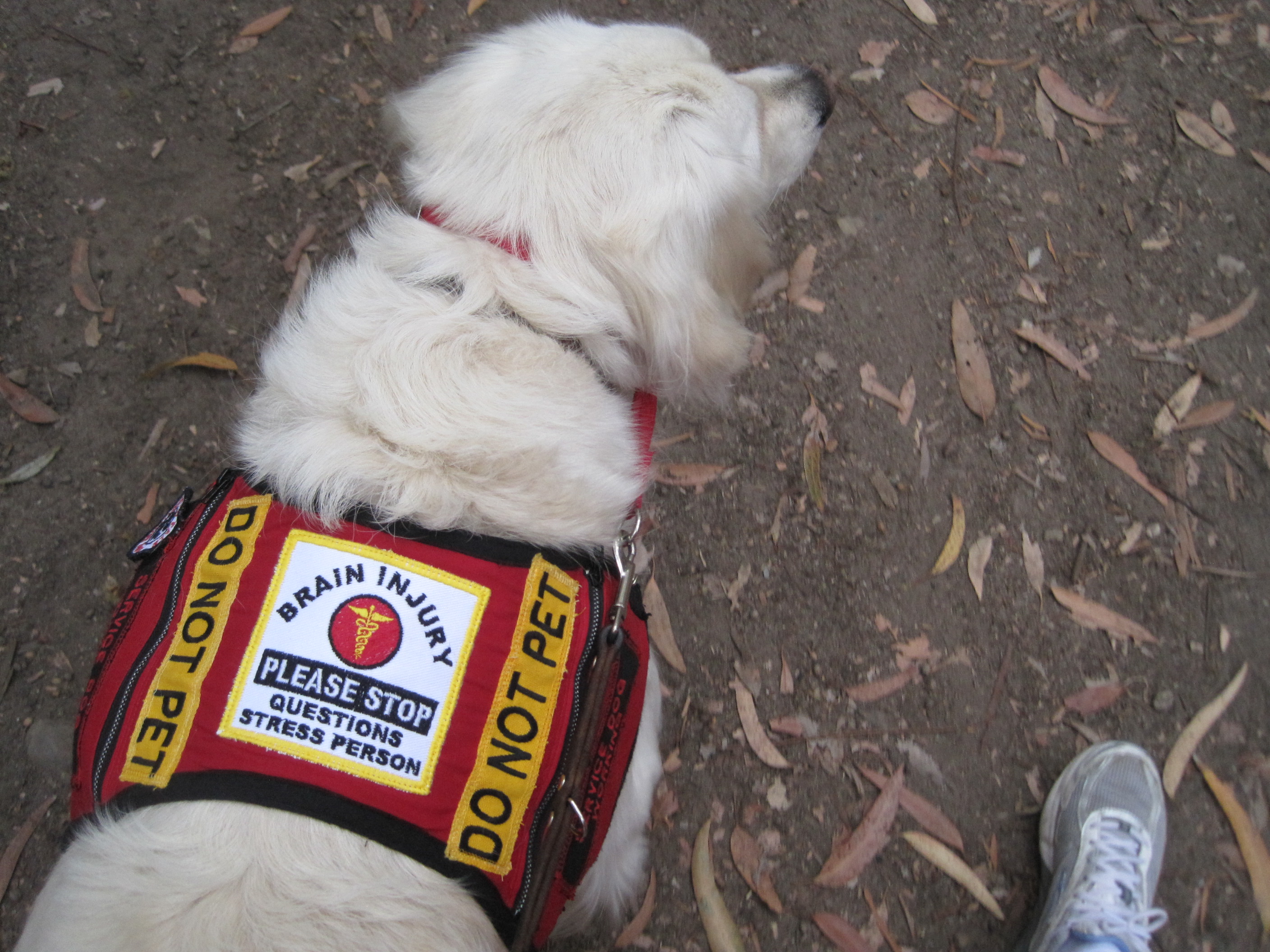 This is another vest I made. It's smaller and lighter in material for when we exercise together. Around the "DO NOT PET" patches (letters were embroidered by someone else), I used a serger machine, something I am learning to use. The patch in the center is my BRAIN INJURY patch and says, "PLEASE STOP ~ QUESTIONS STRESS PERSON."