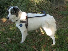 PURPOSE:  The mobility dog harness is to help provide light support for stability and balance to the handler.  A mobility harness is NOT designed for pulling nor guiding.  The guide dog harness IS designed for pulling as the dog leads his/her handler via a controlled pull through the harness.  My mobility harness may help with some pulling because a pull strap may be added to the lower back part of the harness, but I am NOT to pull Christy while she holds onto the handle.