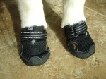 Shoes!  You wear shoes!  You wear shoes?  Why do you wear shoes?  These are my dancing shoes! I’m not too happy standing still to get my shoes on, but once they’re on I just LOVE to DANCE, PRANCE, and WIGGLE-PLAY in them.  Christy usually has to remind me to stop playing becuase it’s time to work.  I do look dapper in my shoes, don’t you think?  I wear shoes when it is really hot outside.  Originally, I was trained in Kansas during the winter months and I loved having cold feet in the snow.  When I arrived here in warmer climate, I didn’t like to walk on warm – not hot – ground.  I was so bothered by warm asphalt that I couldn’t concentrate on helping Christy.  So, the shoes help me stay cool on my footsies and then I can concentrate on my job!  Many service dogs, search and rescue dogs, and even pets who are going out for long hikes or other activities wear shoes for heat/cold protection.  My shoes are Bark’n Boots from http://www.ruffwear.com/.