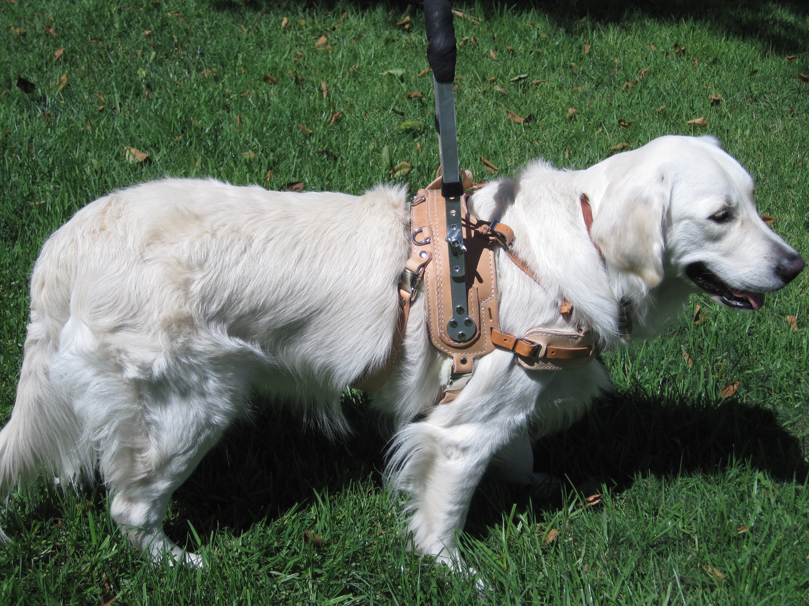 STRUCTURE:  A mobility dog harness and a guide dog harness must each be designed to protect the dog’s structure and be light-weight.  My mobility harness weighs less than 2.5 lbs.  A mobility harness IS NOT designed for the dog to take a person’s full body weight.  A guide harness is not designed to take a person’s body weight at all.  Both the handle on the mobility harness and on the guide harness are rigid, stiff under the handler’s hand.