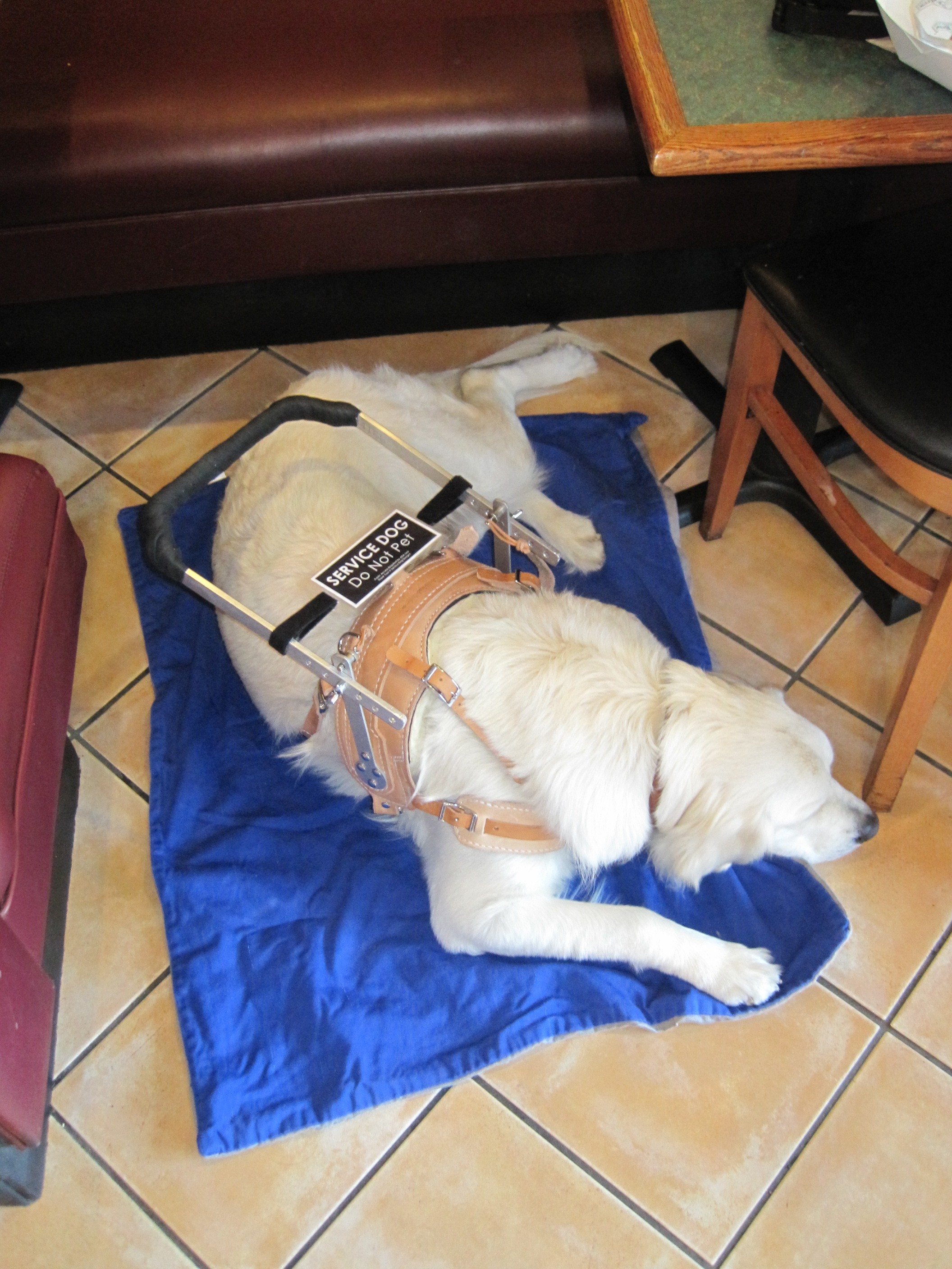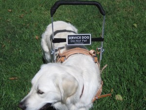 We service dogs “service” or help a person who is disabled.  A disabled person is still an “ABLE” person.  A service dog performs functions and tasks that the disabled person is unable to do or has difficulty doing for him or herself.  The disabled person who works with the service dog is called the “handler.”   I, as a service dog, am protected under the “Americans Disability Act” (ADA).  The ADA is a  law that protects the disabled handler and their service dog,  so they may enter any public business, even restaurants.